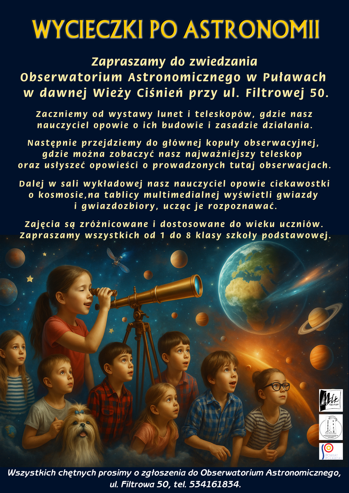 Obserwatorium Astronomiczne w Puławach (w dawnej wieży ciśnień przy ul. Filtrowej 50) zaprasza uczniów klas 1–8 na niezwykłą „WYCIECZKĘ PO ASTRONOMII”!