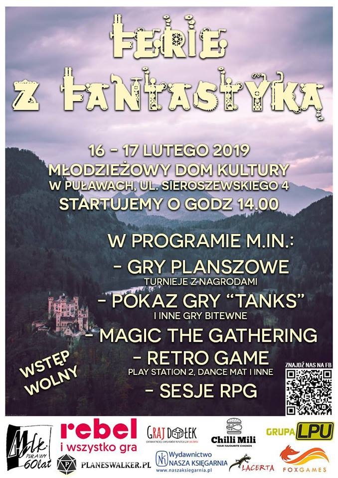 Młodzieżowy Dom Kultury w Puławach w dniach 11-24 lutego organizuje półkolonie zimowe dla uczestników zajęć placówki. Półkolonie będą odbywały się od poniedziałku do piątku w godzinach 9.00-15.00. W programie: warsztaty teatralne, fotograficzne plastyczne, wycieczka do Kazimierza Dln., wyjścia do: kina, krainy zabaw "Maginus", Straży Pożarnej, na Policję, gra terenowa "Poszukiwacze Skarbów", konkurs "Mam Talent", bal karnawałowy. Ferie z Fantastyką W dniach 16 i 17 lutego 2019 zapraszamy na kolejną edycję Ferii z Fantastyką - wydarzenia, które ma na celu integrować i animować społeczność lokalną. Motywem przewodnim jak co roku będzie szeroko pojęta fantastyka, gry planszowe i przede wszystkim dobra zabawa. Wszystkich chętnych zapraszamy do Młodzieżowego Domu Kultury w Puławach znajdującego się przy ul. Sieroszewskiego 4. Impreza zacznie się o godz. 14:00 i będzie trwać nieprzerwanie przez 24 godziny. Udział w wydarzeniu jest bezpłatny.