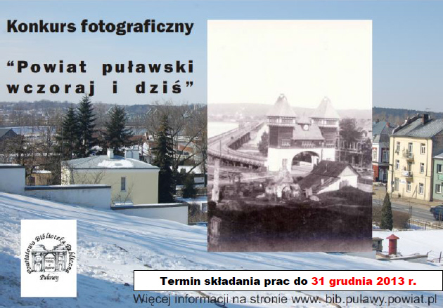 Przypominamy, że celem konkursu jest promocja powiatu puławskiego. Ponadto organizatorzy chcą pokazać zmiany, jakie zaszły na naszym terenie na przestrzeni ostatnich kilkudziesięciu lat. Każdy uczestnik ma za zadanie zgłosić do konkursu zestaw dwóch zdjęć: fotografię archiwalną "tego co wczoraj" i fotografię współczesną "tego co dziś". więcej ... Fotografie powinni ukazywać ten sam "obiekt" kiedyś i teraz. Zajrzyjmy więc do naszych domowych albumów i odkryjmy jakie zmiany zaszły w naszej najbliższej okolicy. Zestaw zdjęć może prezentować budynek, którego dzisiaj już nie ma. Kompleks zabudowań, który zmienił swój kształt. Zestaw może stworzyć fotografia rodzinna sprzed lat i zdjęcie tych samych osób teraz. Konkurs ma charakter otwarty i skierowany jest do wszystkich zainteresowanych. Prace oceniane będą w dwóch kategoriach wiekowych: do 19 lat oraz powyżej 19 lat. Każdy z autorów może nadesłać maksymalnie 3 prace składające się z dwóch zdjęć o wymiarach 20 x 30 cm. Należy dołączyć także wersję elektroniczną (plik cyfrowy JPG). Warunkiem udziału w konkursie jest nadesłanie wraz z pracami formularza zgłoszeniowego. Oceniane będą tylko prace indywidualne i nawiązujące do tematu konkursu a liczyć się będzie: pomysł, oryginalność i styl. Prace należy dostarczyć do PBP w Puławach pocztą lub osobiście (ul. 6 Sierpnia 5, 24-100 Puławy) lub do najbliższej biblioteki publicznej na terenie powiatu puławskiego. Laureaci zostaną powiadomieni o miejscu i terminie wręczenia nagród. Gorąco zachęcamy do wzięcia udziału w konkursie organizatorzy przewidzieli bowiem atrakcyjne nagrody (tablet PC, aparat fotograficzny, MP4 oraz nagrody książkowe). Do pobrania: Regulamin konkursu VI EDYCJA POWIATOWEGO KONKURSU LITERACKIEGO "MIŁOŚĆ NIEJEDNO MA IMIĘ" Zapraszamy do udziału w VI edycji konkursu literackiego "Miłość niejedno ma imię".