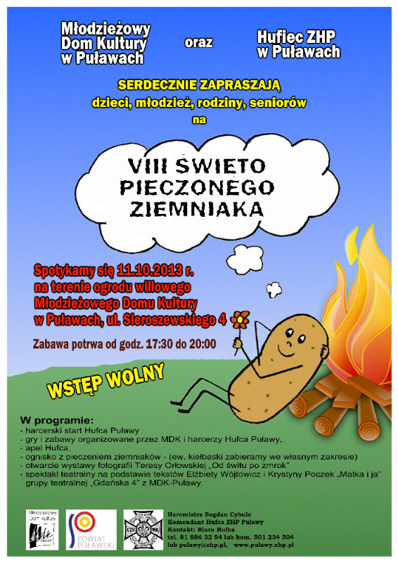 Zapraszamy do fotogalerii ... (fot. Cezary Świderski) VIII Święto Pieczonego Ziemniaka Miejsce: Młodzieżowy Dom Kultury w Puławach, historyczny ogród willowy, Młodzieżowy Dom Kultury oraz Hufiec ZHP w Puławach zapraszają dzieci, młodzież i całe rodziny na VIII Święto Pieczonego Ziemniaka. W programie przewidziano: harcerski start Hufca ZHP Puławy, apel harcerski, gry i zabawy, ognisko z pieczeniem ziemniaków. W tym dniu odbędzie się wernisaż wystawy Teresy Orłowskiej "Fotografia", a także spektakl teatralny na podstawie tekstów Elżbiety Wójtowicz i Krystyny Poczek pt."Matka i ja"