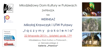 Młodzieżowy Dom Kultury w Puławach organizuje Zgłoszenia przyjmowane są do dnia 11.12.2013 r.: telefonicznie pod numerem 81 8864965 (w godz. 15:00 - 17:00), bądź na adres e-mail: danielmroz@o2.pl z dopiskiem "maraton fotograficzny 2013". Do pobrania: WERNISAŻ WYSTAWY - Mikołaj Krawczyk i UTW Puławy "ŁĄCZYMY POKOLENIA"