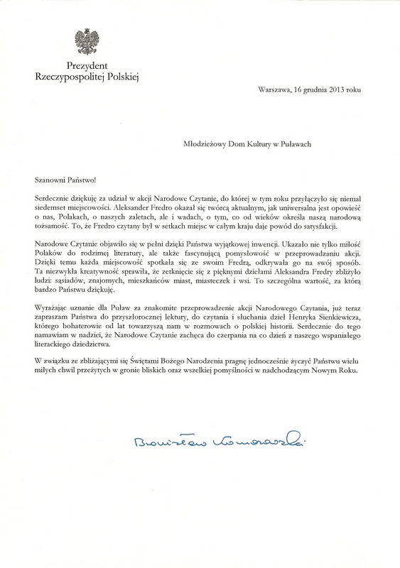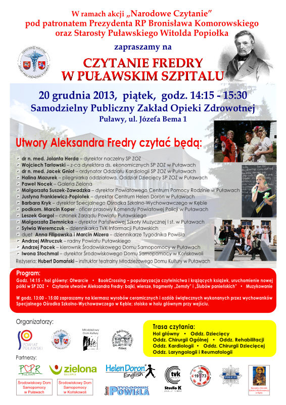 Zapraszamy do fotogalerii ... (fot. SG) CZYTANIE FREDRY W SZPITALU Miejsce: Samodzielny Publiczny Zakład Opieki Zdrowotnej w Puławach, ul. Józefa Bema 1 W ramach akcji "Narodowe Czytanie" pod patronatem Prezydenta RP Bronisława Komorowskiego oraz Starosty Puławskiego Witolda Popiołka zapraszamy na CZYTANIE FREDRY W PUŁAWSKIM SZPITALU. W programie: Mikołaj odwiedził dzieci w MDK W tym roku św. Mikołaj nie zapomniał o dzieciach, które uczestniczą w zajęciach w MDK. Odbyło się szereg imprez integracyjnych. Dzieci malowały portret Mikołaja, układały puzzle z jego wizerunkiem, uczestniczyły w zabawach ruchowych.