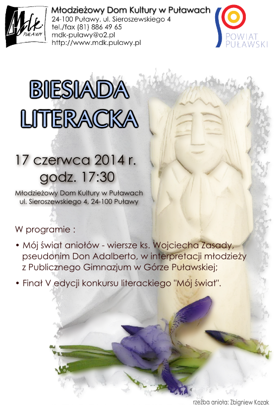 Prowadzenie i koordynacja: Daniel Mróz. PÓŁKOLONIE LETNIE 2014 W dniach od 30 czerwca do 11 lipca 2014 r . Młodzieżowy Dom Kultury w Puławach prowadził półkolonie letnie dla dzieci z miasta i powiatu puławskiego. Uczestnicy półkolonii brali udział w grach i zabawach integracyjnych oraz sportowych na terenie placówki, spacerach, czy wyjściach na basen. Dużo frajdy i radości sprawiły dzieciom ciekawe wycieczki: do "Ogrodu Marzeń" w Trzciankach, do Nałęczowskiego Zwierzyńca Małe Zoo, a także zwiedzanie zagrody wiejskiej w Wojciechowie oraz podchody w Parchatce. UROCZYSTE ZAKOŃCZENIE ROKU SZKOLNEGO Dnia 26 czerwca 2014 r. o godz. 17:00 w Młodzieżowym Domu Kultury odbędzie się uroczyste zakończenie roku szkolnego. Zapraszamy serdecznie. Dnia 17 czerwca 2014 r. o godz. 17:30 zapraszamy do Młodzieżowego Domu Kultury na Biesiadę Literacką. W programie: