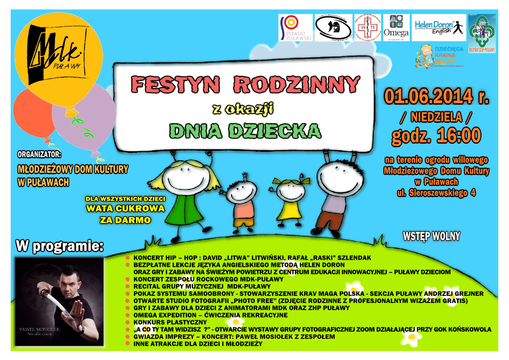 1 czerwca 2014 r. (niedziela) o godz. 16:00 zapraszamy do willowego ogrodu przy Młodzieżowym Domu Kultury w Puławach na Festyn Rodzinny z okazji DNIA DZIECKA. W programie: