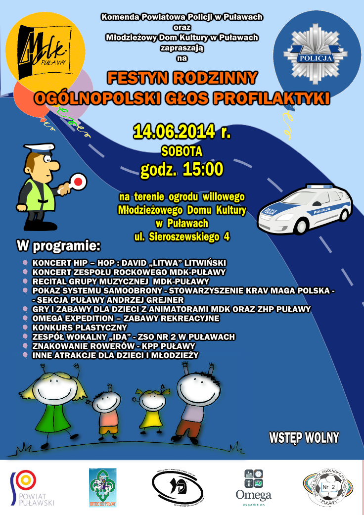 Komenda Powiatowa Policji oraz Młodzieżowy Dom Kultury w Puławach zapraszają na Festyn Rodzinny "Ogólnopolski Głos Profilaktyki", który będzie miał miejsce 14 czerwca 2014 r. (sobota) o godz. 15:00 w willowym ogrodzie przy Młodzieżowym Domu Kultury w Puławach, ul. Sieroszewskiego 4 W programie: