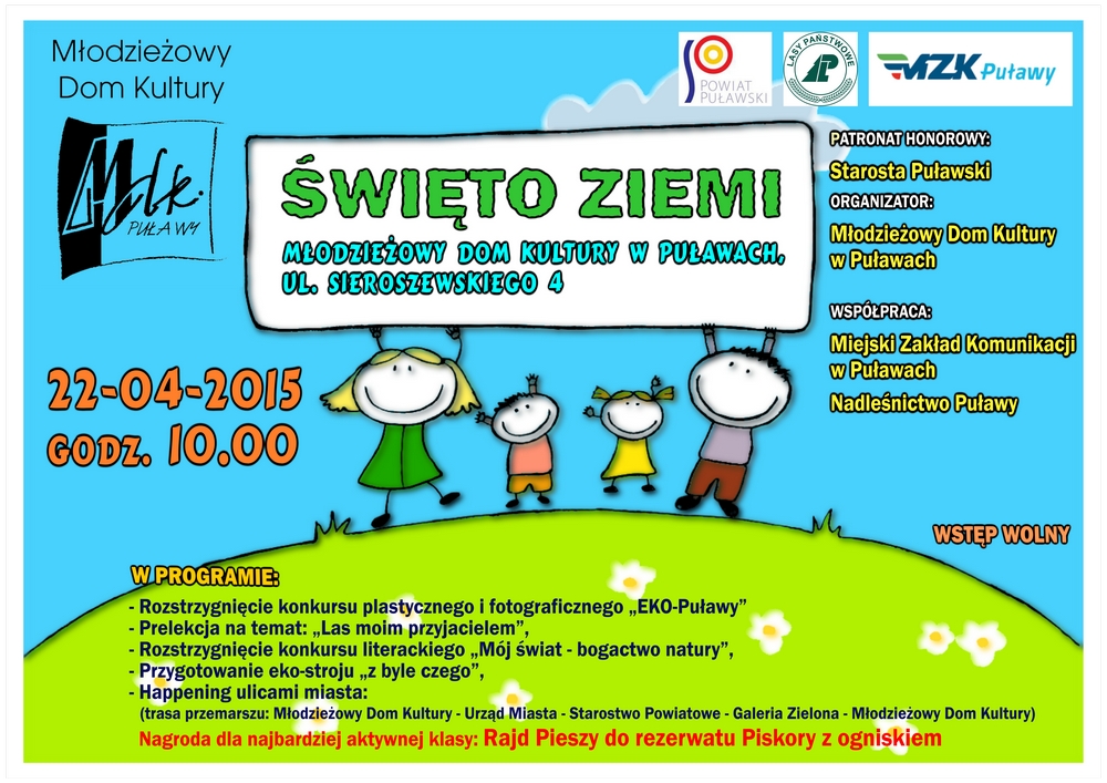 DZIEŃ ZIEMI W MDK 22 kwietnia 2015 o godz. 10.00 zapraszamy do Młodzieżowego Dom Kultury w Puławach na imprezę zorganizowaną w związku z obchodami Światowego Dnia Ziemi.
