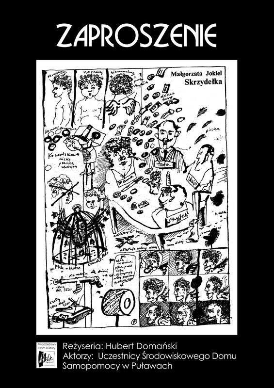 Kolejność wystąpień(*pdf) MIĘDZYNARODOWY DZIEŃ TEATRU Z MDK W ramach Międzynarodowego Dnia Teatru, grupa teatralna Gdańska 4 z Młodzieżowego Domu Kultury w Puławach pod kierownictwem Huberta Domańskiego przygotowała w tym roku szereg spektakli teatralnych, przedstawień plenerowych i spotkań literackich. W tym roku mamy przyjemność zaprezentować poezje Pani Marzeny Romańczuk pt. Ujęta w cudzysłów, która to pierwsza odsłona miała miejsce w dniu 09.03.2015 w MDK w Puławach. tekst: Hubert Domański Spektakl "Skrzydełka" na podstawie scenariusza Małgorzaty Jokier, w reżyserii Huberta Domańskiego będzie miał swój pokaz pracy 16.03.2015 w Środowiskowym Domu Samopomocy przy ul. Wólka Profecka 26 w Puławach o godz. 12.00. Spektakl powstał ze współpracy Młodzieżowego Domu Kultury w Puławach i Środowiskowego Domu Samopomocy w Puławach. Inscenizacja teatralna opowiada o normalnej rodzinie, w której rośnie dziecko o nadzwyczajnych i nieludzkich cechach. Od odpowiedzi Kogo skubać ?, zaczynają się właściwe problemy. Spektakl jest pewnego rodzaju protestem przeciw metodom wychowania dziecka na wzór i podobieństwo współcześnie obowiązującego modelu ludzkiego, przeciw ogłupieniu i tresurze. KONKURS LITERACKI "MÓJ ŚWIAT - BOGACTWO NATURY" - VI edycja Prace konkursowe należny przesłać na adres mailowy gosklin@o2.pl lub dostarczyć do sekretariatu MDK-Puławy w terminie do dnia Do pobrania: REGULAMIN KONKURSU (*pdf) MARCOWE ELIMINACJE DO FINAŁU KONKURSU W dniu dzisiejszym w Młodzieżowym Domu Kultury w Puławach zostały przeprowadzone eliminacje do czwartej edycji konkursu pt. "Babciu, Dziadku opowiedz mi bajkę". Celem imprezy jest zachęcanie dzieci do samodzielnych poszukiwań ciekawych tekstów: baśni, bajek i prezentacja ich przed publicznością. Jury ocenia pamięciowe opanowanie tekstu, poprawność językową, umiejętność nawiązania relacji ze słuchaczami, ogólny wyraz artystyczny, w tym kostium.