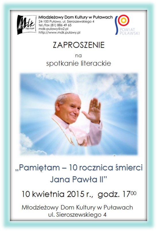 10 kwietnia 2015 o godz. 17.00 w Młodzieżowym Domu Kultury pracownia literacka organizuje spotkanie poświęcone papieżowi Janowi Pawłowi II.