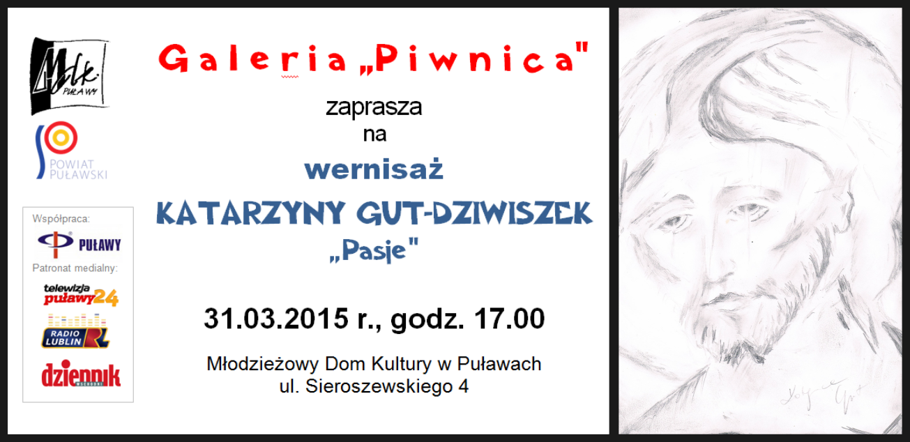 Do współpracy przy realizacji przedsięwzięcia przyjęło zaproszenie Publiczne Gimnazjum Nr 1 im. Jana Pawła II w Puławach oraz Gimnazjum im. Jana Pawła II w Żyrzynie. (tekst: M.K.) WYSTAWA RYSUNKÓW KATARZYNY GUT-DZIWISZEK 31 MARCA 2015 o godz. 17.00 zapraszamy do galerii "Piwnica" na wernisaż wystawy rysunków Katarzyny
