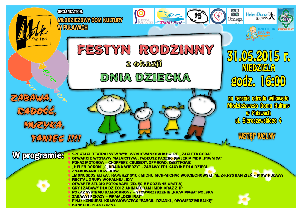 Serdecznie zapraszamy na Festyn Rodzinny z okazji Dnia Dziecka. Impreza będzie miała miejsce na terenie ogrodu willowego Młodzieżowego Domu Kultury w Puławach w dniu 31 maja 2015 r. (niedziala) od godz. 16.00. Program obejmuje m.in.: Spektakl teatralny w wyk. wychowanków MDK pt. Zaklęta Góra * Otwarcie wystawy malarstwa: Tadeusz Paszko (MDK Galeria Piwnica) * Pokaz motorów: choppery, cruisery, off-road, zabytkowe * HELEN DORON / KRAINA WIEDZY - zabawy edukacyjne dla dzieci * Znakowanie rowerów * "Monogłos Klika", raperzy (MC): Michu MCH-Michał Wojciechowski, Neiz-Krystian ZieńRecital grupy wokalnej Ida * Otwarte studio fotografii (zdjęcie rodzinne gratis) * Gry i zabawy dla dzieci z animatorami MDK oraz ZHP * Pokaz systemu samoobrony Stowarzyszenie KRAV MAGA POLSKA * Zabawy i pokazy firma DZIKI RAJ * Finał Konkursu Krasomówczego "Babciu, dziadku, opowiedz mi bajkę" * Konkurs plastyczny. XVI WOJEWÓDZKI FESTIWAL WSPÓŁCZESNYCH FORM TANECZNYCH