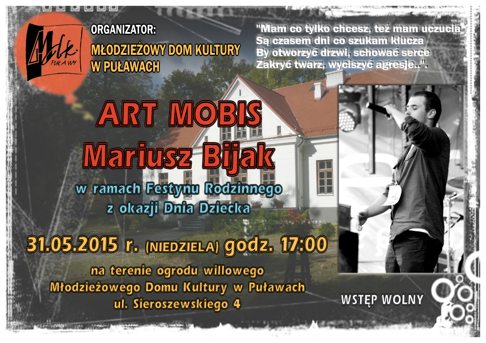 31 maja 2015 r. o godz. 17.00, w ramach Festynu Rodzinnego z okazji Dnia Dziecka, w ogrodzie przy MDK Puławy wystąpi ART MOBIS (Mariusz Bijak). Artysta zajmuje się tworzeniem różnych gatunków muzycznych jak np. Hip Hop połączony z muzyką rock, reggae. To co on robi nie jest czystym ulicznym rapem, a tylko jego podgatunkiem !