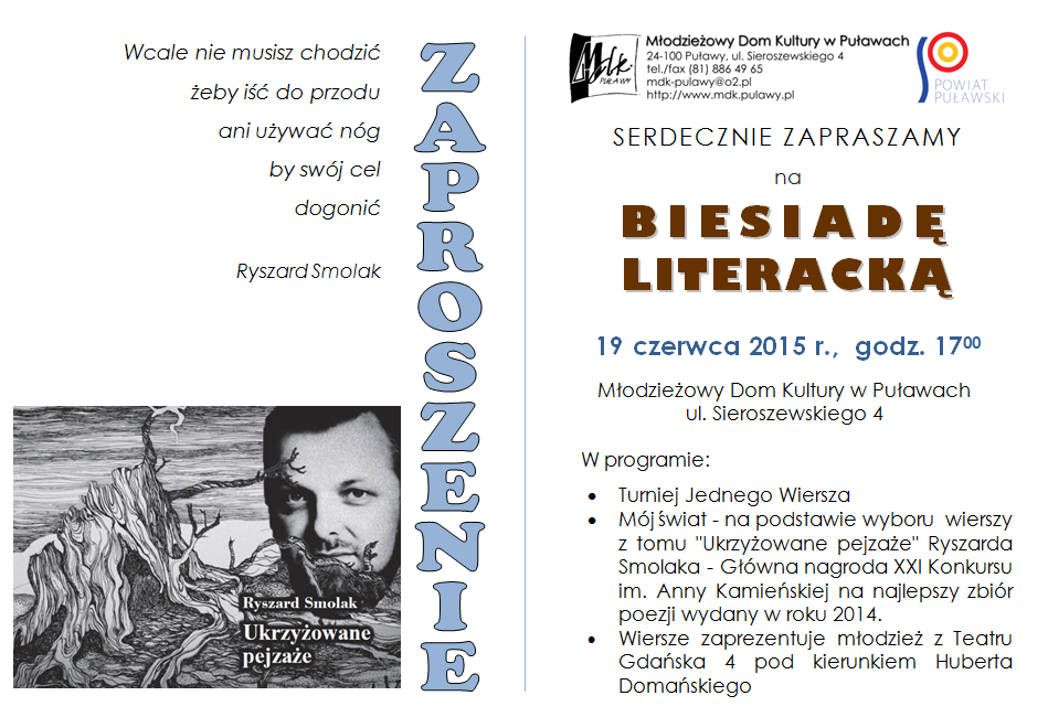 Dnia 19 czerwca 2015 r. o godz. 17:00 zapraszamy do Młodzieżowego Domu Kultury na Biesiadę Literacką. W programie: