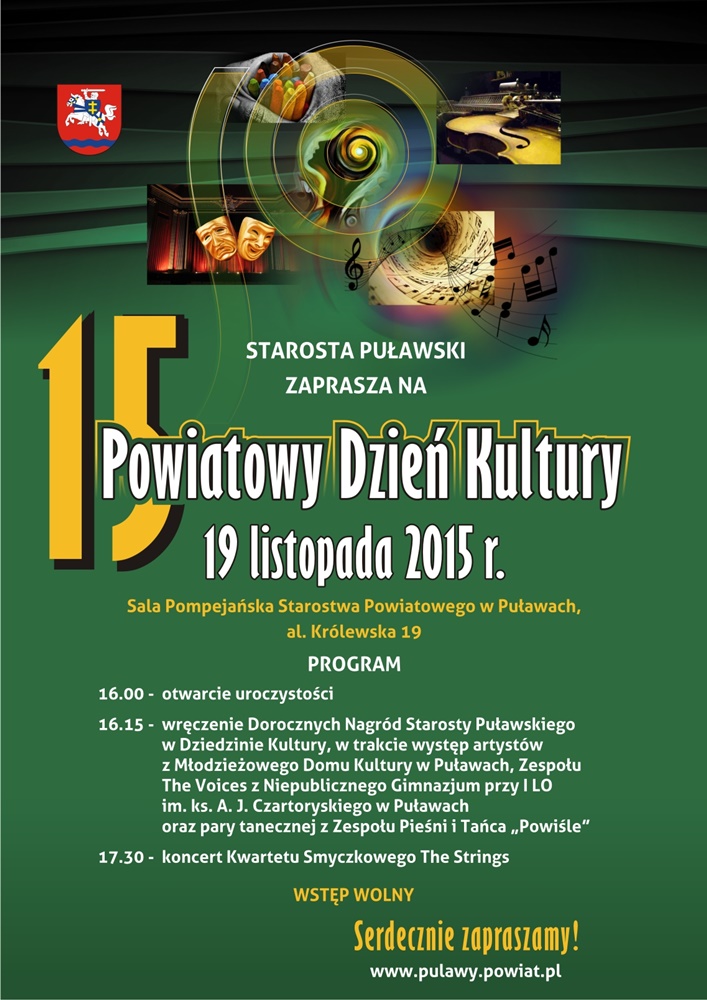 Zadanie polega na wykonaniu z własnych materiałów ozdoby choinkowej. Prace należy dostarczyć do Młodzieżowego Domu Kultury w Puławach do dnia Do pobrania: Regulamin konkursu XV Powiatowy Dzień Kultury