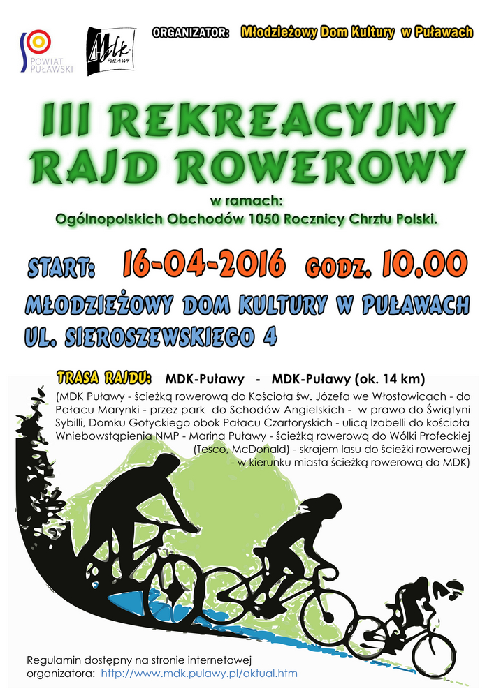 Zapraszamy do udziału w Konkursie Fotografii "Narodziny Polski", zorganizowanego w ramach uczczenia 1050 rocznicy Chrztu Polski - powstania Państwa Polskiego. Konkurs jest bezpłatny, skierowany do uczniów i studentów. Organizator nie stawia żadnych ograniczeń w interpretacji tematu. Prace przyjmowane będą do dnia Do pobrania: REGULAMIN KONKURSU (*pdf) V EDYCJA KONKURSU KRASOMÓWCZEGO "BABCIU DZIADKU, OPOWIEDZ MI BAJKĘ" W dniach 5 marca 2016 r. - po raz drugi w tym roku szkolnym - odbyły się prezentacje w konkursie krasomówczym. Bajki i baśnie opowiadały dzieci ze Szkoły Podstawowej nr 11 oraz ze szkoły w Górze Puławskiej . Oceniana była poprawność wypowiedzi, dykcja i wymowa oraz swoboda i płynność prezentowanego tekstu. Dodatkowy plus uczestnik otrzymywał za przygotowany kostium. Do finału, który odbędzie się z Okazji dnia Dziecka, zakwalifikowani zostali uczniowie pani Moniki Mocarskiej ze szkoły Podstawowej nr 11: Zuzanna Moskalik; Katarzyna Kiełbasa i Maciej Lisowski. W ramach Obchodów 1050. Rocznicy Chrztu Polski i Powstania Państwa Polskiego Młodzieżowy Dom Kultury w Puławach organizuje III Rekreacyjny Rajd Rowerowy. Start planowany jest 16.04.2016 r. o godz. 10.00 z pod siedziby MDK ul. Sieroszewskiego 4. Wszystkich zainteresowany serdecznie zapraszamy. Do pobrania: >>>REGULAMIN RAJDU<<< VII KONKURS LITERACKI "MÓJ ŚWIAT - WIEŚ JAKĄ ZNAM" Prace konkursowe należny przesłać na adres mailowy gosklin@o2.pl lub dostarczyć do sekretariatu MDK-Puławy w terminie do dnia Do pobrania: REGULAMIN KONKURSU (*pdf) KONKURS PLASTYCZNY "NARODZINY POLSKI"