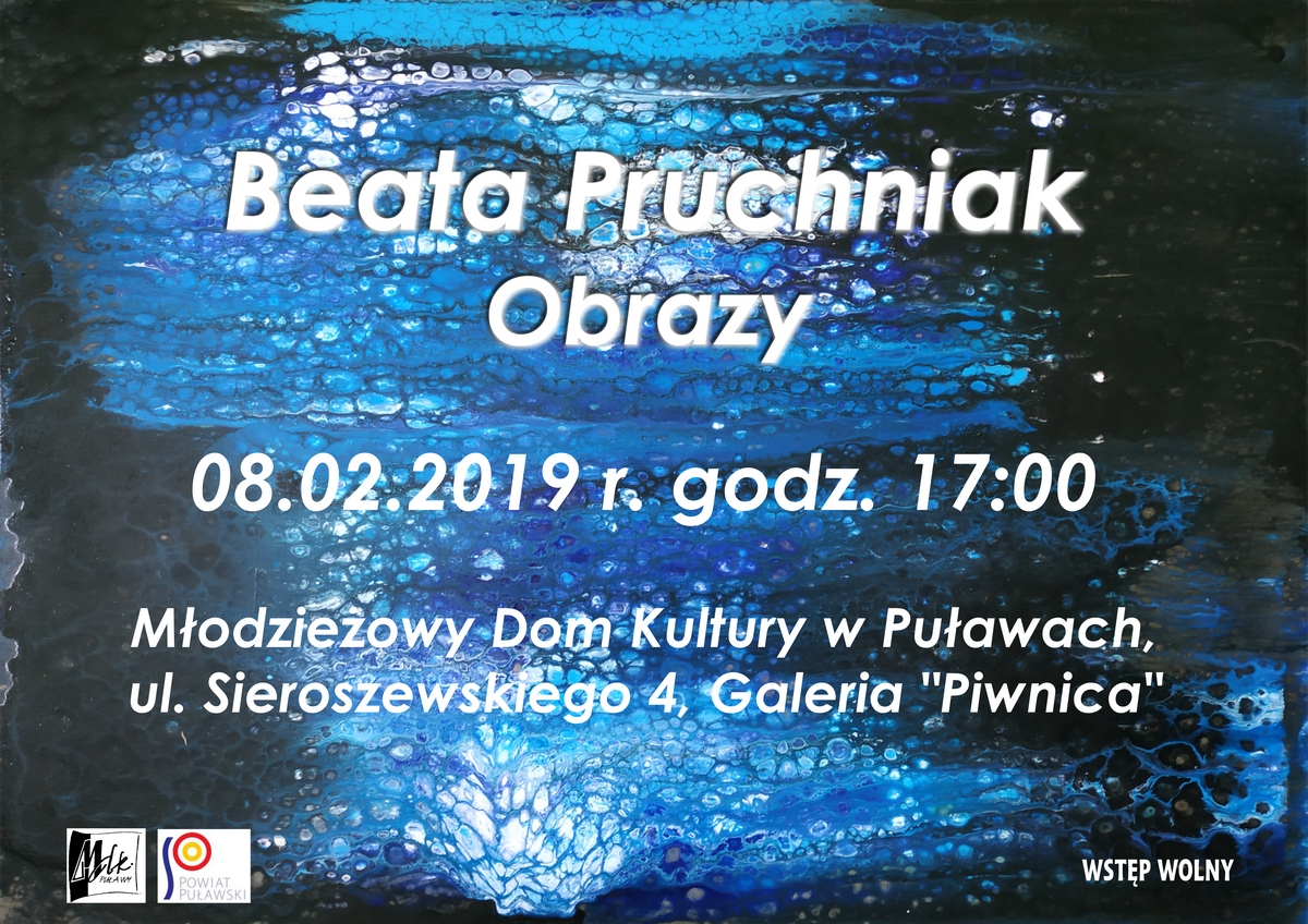 6 lutego o godzinie 12.00 w Młodzieżowym Domu Kultury odbędzie się Powiatowy konkurs krasomówczy "Złotousty". Młodzież z puławskich i powiatowych szkół zaprezentuje swoje zdolności oratorskie przed publicznością. Każdy z uczestników wypowie się na na jeden z trzech tematów: Krótkie życie buraka, Jeden dzień z życia kapelusza w maju lub Dlaczego kwiatki piją wodę?. Jury oceni swobodę wypowiedzi przed publicznością, oryginalność, poczucie humoru i ogólny wyraz artystyczny. Do pobrania: PROGRAM KONKURSU Beata Pruchniak- Obrazy Młodzieżowy Dom Kultury w Puławach zaprasza na Wystawę: 'Beata Pruchniak- Obrazy'. Wernisaż wystawy odbędzie się 8 lutego 2019 r. o godz. 17.00 w Galerii "Piwnica" MDK przy ul. Sieroszewskiego 4 w Puławach