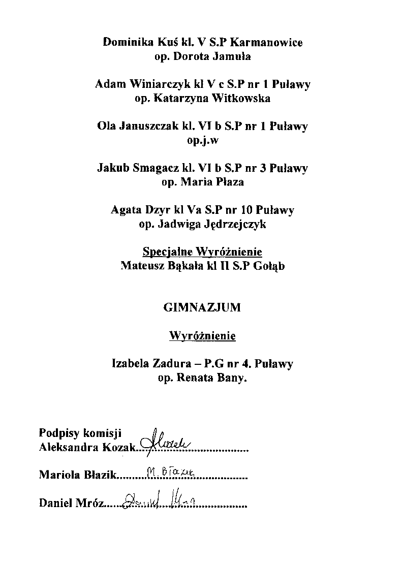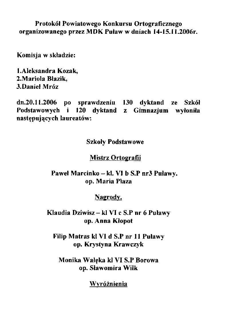 - prace w dowolnych technikach plastycznych, o formacie max. A2, karty świąteczne, ozdoby choinkowe, lampiony, itp. Warsztaty plastyczne dla nauczycieli - sztuka użytkowa, dekoracje świąteczne Dnia 4 grudnia 2006 r. o godz. 16.00 w pracowni teatralnej MDK-Puławy odbyły się warsztaty plastyczne dla nauczycieli. Miały one na celu zapoznanie uczestników z nowymi technikami dekoracyjnymi oraz wymianę doświadczeń i technik pomiędzy zainteresowanymi nauczycielami. Warsztatom towarzyszyła wystawa p. Katarzyny Gospodarek - członkini Towarzystwa Twórców Ludowych, prowadzącej warsztaty. Każdy uczestnik otrzymał zaświadczenie o ukończeniu warsztatów. Zobacz więcej zdjęć w galerii ... Wystawa fotografii "INDIE" 24 listopada o godz. 16.00 w galerii "Piwnica" Młodzieżowego Domu Kultury miał miejsce wernisaż wystawy fototografii autorstwa Joanny Durakiewicz oraz Dominiki Bedryjczuk, prezentującej odległe zakątki Indii. Zobacz więcej zdjęć w galerii ... Wyniki Powiatowego Konkursu Ortograficznego Do konkursu przystąpiło 254 ucznów z 27 szkół podstawowych oraz gimnazjalnych miasta i powiatu puławskiego. Tytuł MISTRZA ORTOGRAFII w kategorii szkół podstawowych jury konkursu przyznało uczniowi klasy VI b Szkoły Podstawowej Nr 3 w Puławach - Pawłowi Marcinko pod opieką nauczycielki p. Marii Płazy. Tutaj znajdziesz wyniki konkursu ... Zobacz więcej zdjęć w galerii ... Wyniki konkursu poetyckiego "Ojczyzno (...) niechaj Cię opiszę"