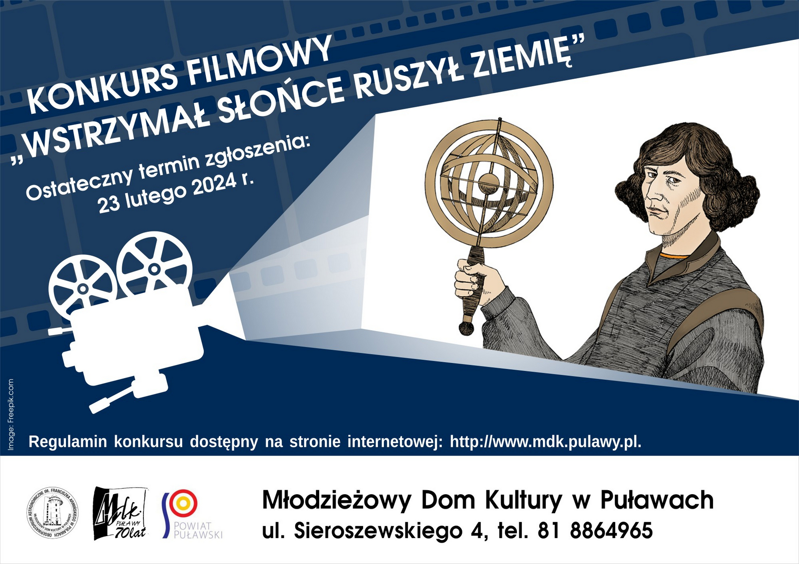 Młodzieżowy Dom Kultury w Puławach zaprasza uczniów klas VI-VIII szkół podstawowych oraz uczniów szkół ponadpodstawowych z powiatu puławskiego do udziału w Konkursie Filmowym „Wstrzymał Słońce ruszył Ziemię”.